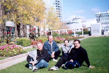 From left, Vladimir Borisenko, Anatoliy Khrustitskiy (An 124 Capitan), Aleksandr Zakharov, Sergey Kruts (An 124 Flight Engineer) near Burnaby Public Library (Vancouver).